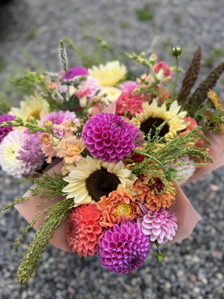 Birkegårdens Blommor erbjuder färska, handbundna buketter skapade från blommor odlade på vår egen gård.